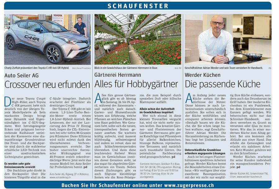 Möchten Sie ein neues Produkt lancieren, die Neueröffnung Ihrer Firma bekanntmachen oder auf einen speziellen Firmenevent aufmerksam machen? Haben Sie eine wichtige Mitteilung an Ihre Kunden? Hiermit haben wir für Sie das ideale Angebot – das «Schaufenster»! Hier können Sie Ihre Daten erfassen und ein Bild hochladen. Die Rubrik Schaufenster hat ihren regelmässigen Platz jeweils am Dienstag in der Grossauflage der Zuger Presse (inklusive Zugerbieter), und wird in sämtliche Haushalte des Kantons Zug in einer garantierten Auflage von derzeit über 55 000 Exemplaren verteilt.