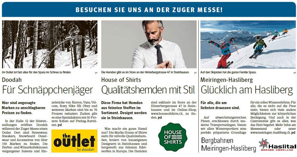 Dann liegen Sie mit einem Standporträt in der Spezialausgabe von Zuger Presse und Zugerbieter zur Zuger Messe genau richtig! Im Standporträt können Sie ein Bild, Ihr Logo und einen kurzen Text platzieren. Erscheinungstag Zuger Messe Zeitung ist Mittwoch, 16. Oktober 2019. So erreichen Sie mehr als 55000 Haushalte im Kanton Zug.